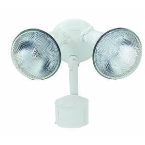 Motion activated twin floodlight. 30 motion detection zones. Turns lights On automatically when motion is detected; detects motion at 180 and up to 70'. Covers approximately 7600 sq. ft. Power outage protection: Saves energy by automatically resetting at dawn if lights are triggered by power interruption. Adjustable time and sensitivity settings. Large oversize knobs for easy setup. Convenient tool free lamp and sensor head adjustment. Strong die cast metal lampholders and coverplate for extra long life. Perfect for wall or eave mounting. Center mount 1 screw design for easy installation. Preassembled and prewired for easy installation. Takes 2 PAR38 incandescent 120/130V, 150W maximum bulbs (not included). UL and CSA listed for wet locations. 2 year limited warranty.