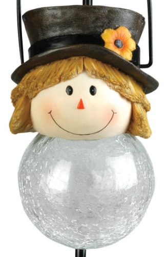 Moonrays 96961 ScareCrow Pendant Solar Holiday Path Light. Decorate the entrance to your home with this hanging pendant light. The statue head is made of sturdy polyresin material, with the glowing ball made of glass. The pole and stake is made of metal. The LED inside is pure white. Includes rechargeable AA NiCd batteries. Battery included is AA NiCd. White light glows at night and batteries charge during the day in the sun. happy scarecrow is a fun way so show holiday spirit in the neighborhood. The solar panel is on the top of the hat, recommended full day of sunlight to charge