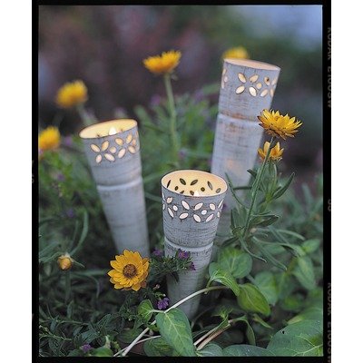 Illuminate a garden path with these cone tea lights. Set includes one of each: 7-3/4-inch h, 9-7/8-inch h, and 11-3/4-inch h. Beautifully stamped out pattern allows candle light to show through.